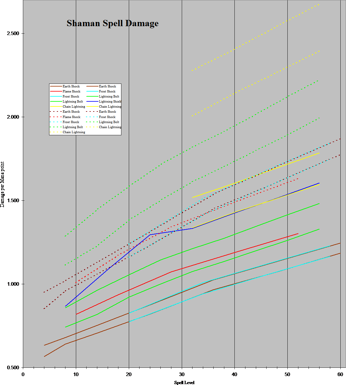 Damage-based Shaman spells, displayed as damage-per-mana-point.