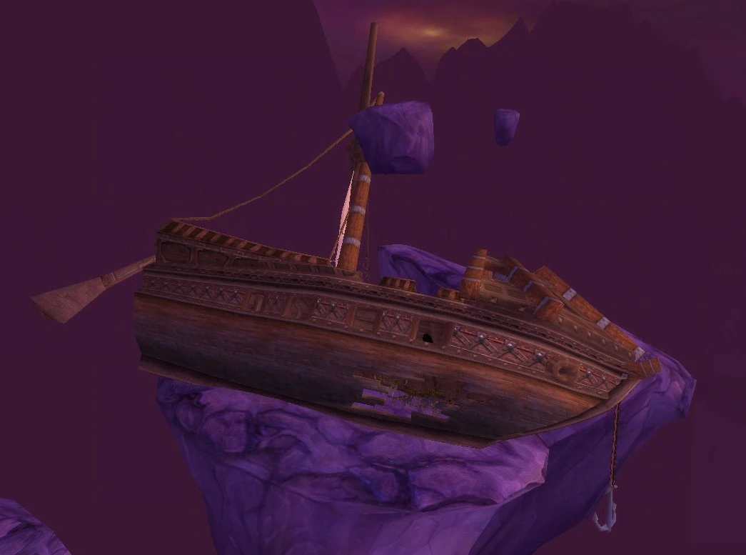 An abandoned ship stranded on a rock in the Twisting Nether.